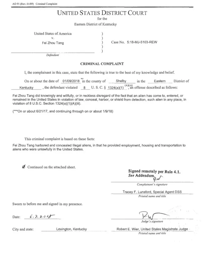 美国移民及海关执法局(USICE)在今年1月突袭肯塔基州位于Shelbyville市的亚洲自助中餐馆、珍宝自助中餐馆(Jumbo Buffet)、Grand Buffet,及位于佛兰克佛特市(Frankfort)另一家亚洲自助餐馆的餐厅和员工住所,逮捕汤飞洲。他是目前全案第一名被控的餐馆业者。