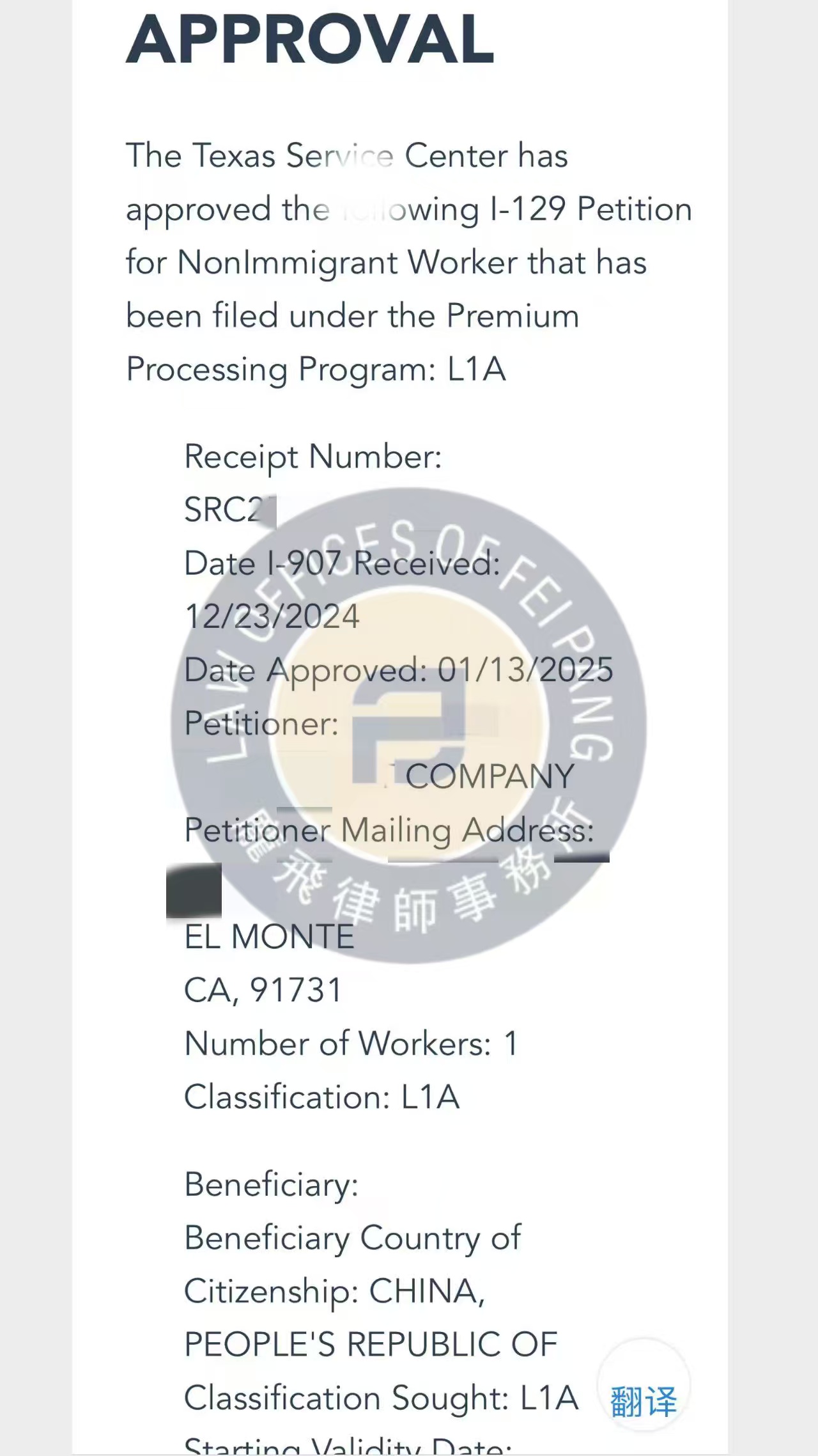 2024年年初,X先生委托我所为期办理L1A工作签证,以便其更好的管理中美两边的公司。材料整理中,发现其母公司的名字翻译与美国公司股权证上的名字不一致,并且在过去的客户合同中,也有多种公司的翻译,这样容易造成移民官的困惑,于是让客人准备了关于不同名字的公证文件,以及公司大股东的声明,说明为何会有多种名称的翻译。由于公司管理上的疏忽,美国因先后注册了多家公司,后其他公司又注销了,但名字持续使用于各种合同,发票及客户沟通中。随即我们挑选了名称一致的文件提交至移民局。5/1/2024顺利获批。