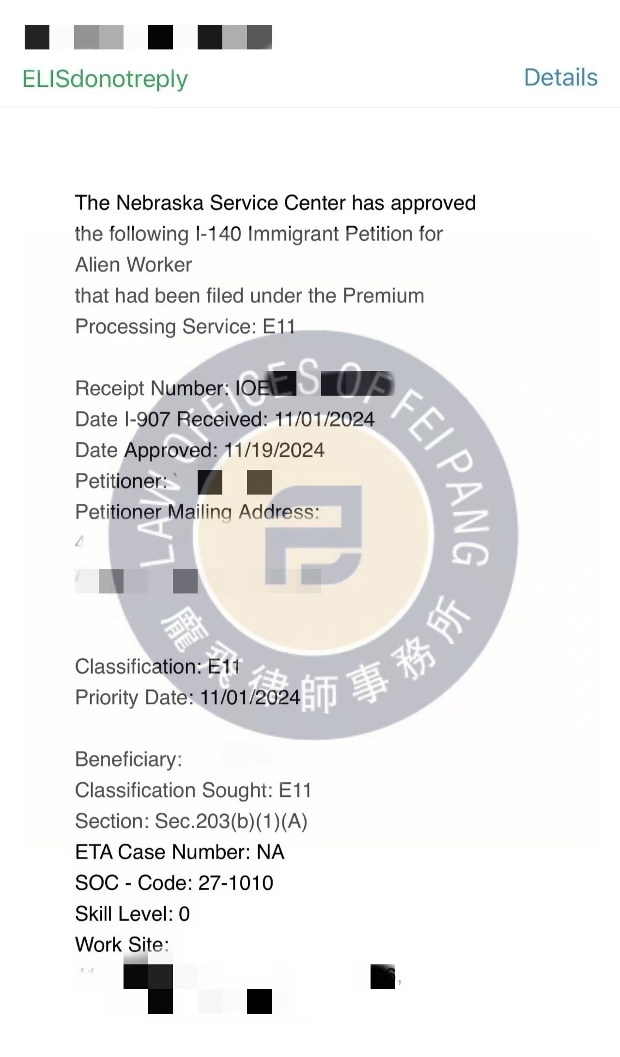 客户2024年11月01日收到移民局的收件确认。移民局在11月19日无补件直接批准了客户的杰出人才EB1A申请批准,共计13个工作日。