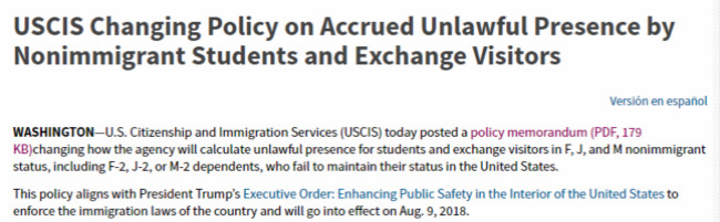 2018年5月10日,移民局曾公布了一份关于在美F/J/M学生如何计算非法滞留时间的的草案,预计在2018年8月9日生效。然而,就在5月18日,SEVIS发布了一份行政命令草案,警告关于不允许不符合条件的志愿者职位列入OPT合法工作范围。