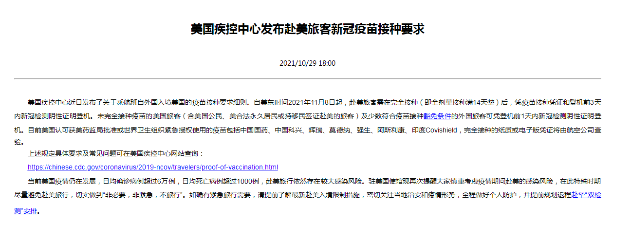 1. 新冠疫苗。美国疾控中心(Centers for Disease Control and Prevention)在2021年11月发布了关于自外国入境美国的疫苗接种要求细则,自美东时间2021年11月8日起,赴美旅客需在完全接种(即全剂量接种满14天整)后,凭疫苗接种凭证和登机前3天内新冠检测阴性证明登机。未完全接种疫苗的美国旅客(含美国公民、美合法永久居民或持移民签证赴美的旅客)及少数符合疫苗接种豁免条件的外国旅客可凭登机前1天内新冠检测阴性证明登机。目前美国认可获美药监局批准或世界卫生组织紧急授权使用的疫苗包括中国国药、中国科兴、辉瑞、莫德纳、强生、阿斯利康、印度Covishield,完全接种的纸质或电子版凭证将由航空公司查验。上述规定具体要求及常见问题可在美国疾控中心网站查询:https://chinese.cdc.gov/coronavirus/2019-ncov/travelers/proof-of-vaccination.html.